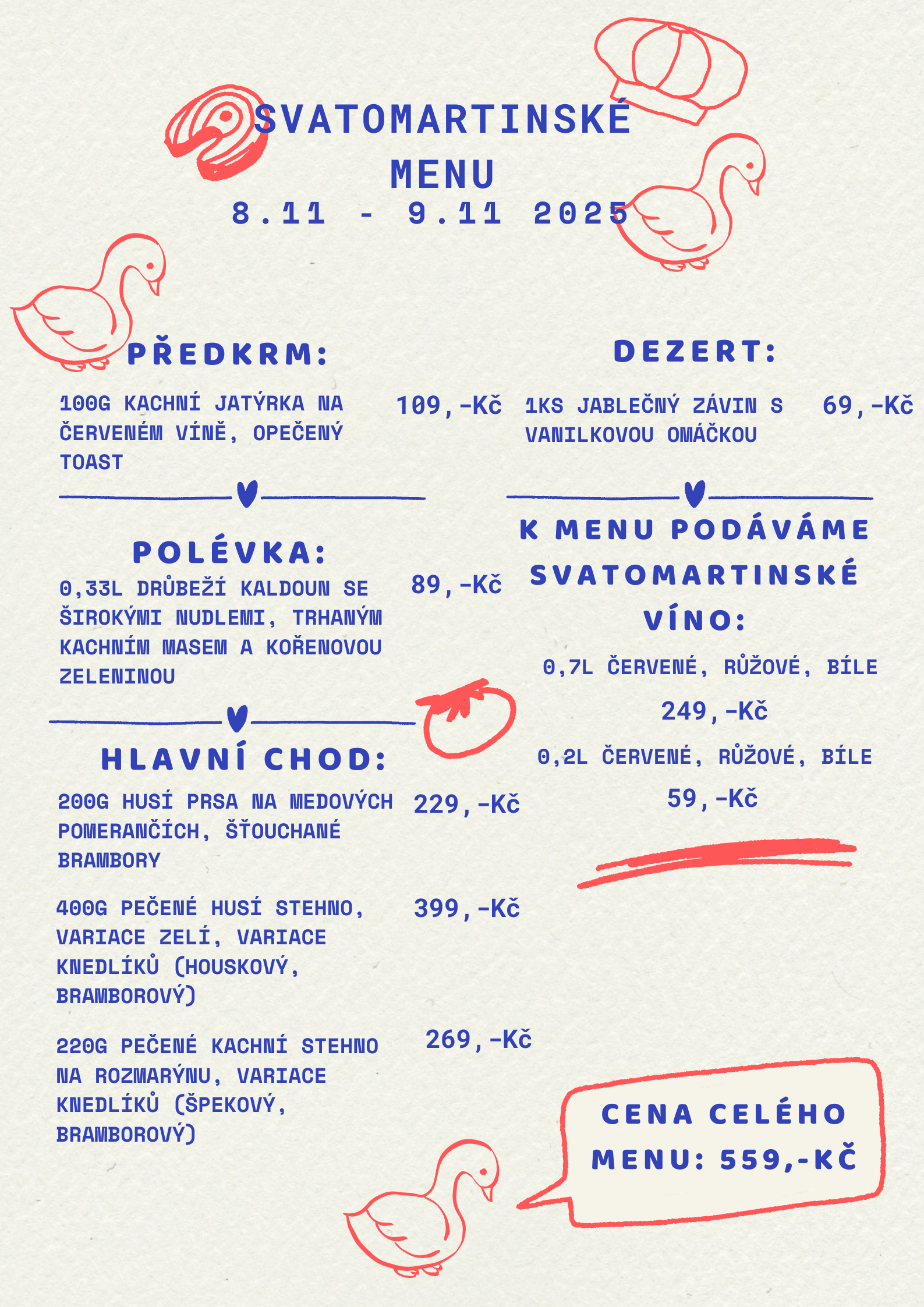 Vychutejte si tradiční svatomartinskou husu a dalši skvělá jídla a oslavte s námi svátek svatého Martina.