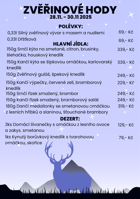 Zveme vás na Zvěřinové hody v hotelu Bon, kde si vychutnáte speciality z divočáka, daňka či srnce, doplněné o domácí knedlíky, brusinkové omáčky a další podzimní dobroty.